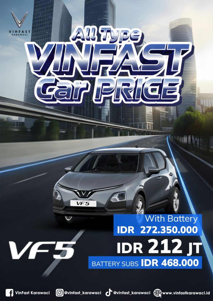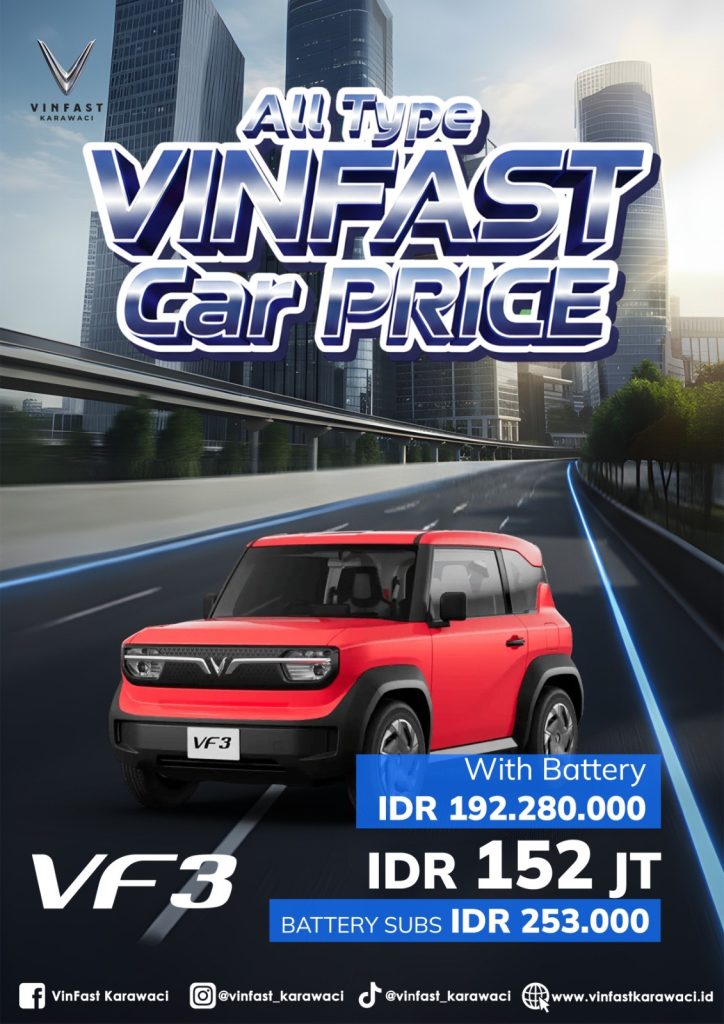 Si kecil yang penuh gaya! VF3 adalah city car listrik yang dirancang untuk kamu yang aktif, fun, dan selalu ingin tampil beda. Dengan desain yang compact tapi berkarakter, mobil ini cocok buat melaju lincah di jalanan kota. Playful, stylish, dan hemat energi—VF3 adalah pilihan sempurna untuk mobilitas modern tanpa ribet!